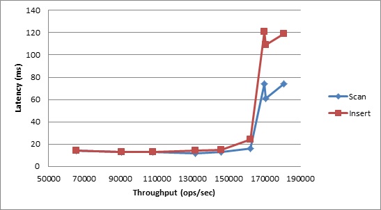 Second, I ran against a 12-node cluster and incrementally added client threads. This was accomplished by adding additional client machines, each running 150 threads. The purpose here is to demonstrate how much load the cluster can handle before seeing a noticeable impact in terms of latency. It’s worth noting in these results that latencies remain essentially flat until a point just short of peak throughput. This behavior is not only true of average latencies, but is completely preserved at the 99th percentile.