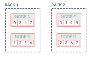 Placing the partition replicas with rack-awareness prevents putting all partition replicas on the same rack, increasing the probability the cluster will remain available on node failures. Without this functionality, all nodes are equal when considering the next node to replicate a partition. If there are enough nodes on the same rack to satisfy the specified k-safety level, it is possible to inadvertently assign all replicas of a partition to nodes on the same rack.