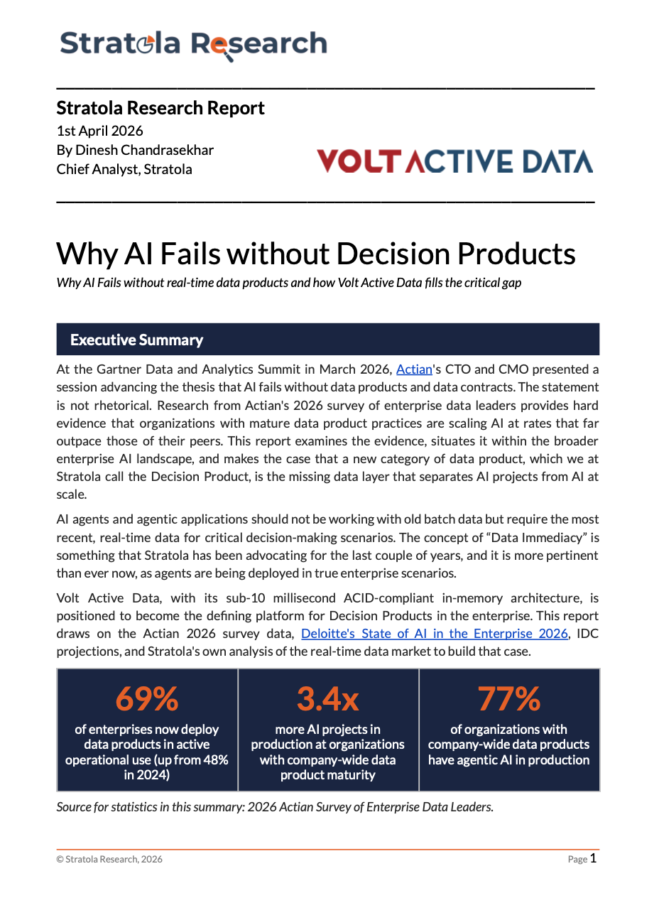 This analyst report from Stratola Chief Analyst Dinesh Chandrasekhar examines why data product maturity has become the single strongest predictor of AI success in the enterprise. Drawing on the 2026 Actian Survey of Enterprise Data Leaders, Deloitte’s State of AI in the Enterprise 2026, and IDC market projections, the report introduces Decision Products as the fourth and most critical tier of data product maturity, the layer that converts streaming infrastructure into real-time, authoritative decisions. Organizations with company-wide data product maturity are scaling AI at 3.4x the rate of those without it. The report explains why, and what it takes to close the gap.